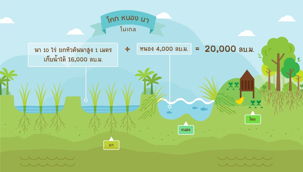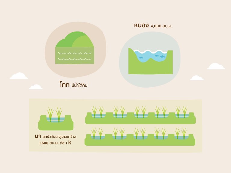 นา ยกหัวคันนาให้กว้างและสูงอย่างน้อย 1 เมตร ธรรมชาติของข้าวจะทะลึ่งน้ำไม่จมน้ำตาย เพื่อเพิ่มพื้นที่กักเก็บน้ำไว้ในนา ขุดร่องใกล้หัวคันนา เป็นที่อยู่ของปลา ปู ปั้นหัวคันนาให้มีความกว้างมากพอที่จะปลูกต้นไม้ พืชผัก ให้มีรากยึดเหนี่ยวคันนา และเพิ่มพื้นที่ทำกิน