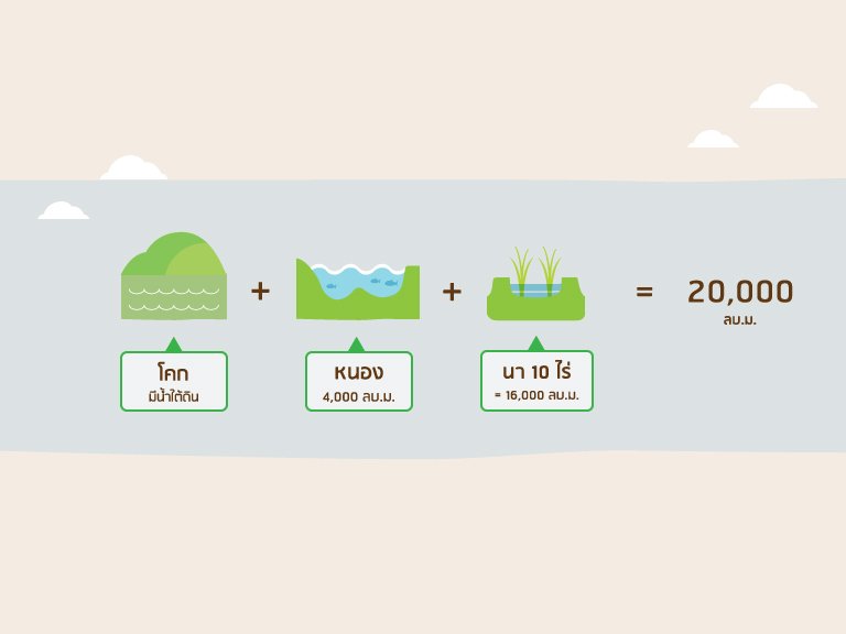 ด้วยรูปแบบ “โคก หนอง นา โมเดล” นี้ หากมีเกษตรกรมีพื้นที่รายละ 10 ไร่ คิดเป็น 1 หลุมขนมครก จะสามารถเก็บกักน้ำได้ปีละประมาณ 40,000 ลูกบาศก์เมตรต่อปีโดยเป็นน้ำบนดินประมาณ 20,000 ลูกบาศก์เมตร และเมื่อมีป่าชุ่มชื้นจะสามารถเก็บกักน้ำใต้ดินได้เพิ่มขึ้นอีก ถ้าทุกคนในลุ่มน้ำป่าสัก หรืออย่างน้อย 100,000 ราย ร่วมมือร่วมใจกันสร้าง 100,000 หลุมขนมครก จะสามารถเก็บกักน้ำได้กว่าสี่พันล้านลูกบาศก์เมตรต่อปี คิดเป็นมากกว่า 4 เท่าของความจุเขื่อนป่าสักชลสิทธิ์ จะสามารถแก้ไขปัญหาน้ำท่วมได้และที่สำคัญคือมีน้ำเก็บไว้ใช้ยามหน้าแล้ง สามารถปลูกพืชพันธุ์ได้ตลอดปี มีพอกิน พออยู่ พอใช้ เกิดทั้ง “ประโยชน์ตนและประโยชน์ท่าน” ในเวลาเดียวกัน