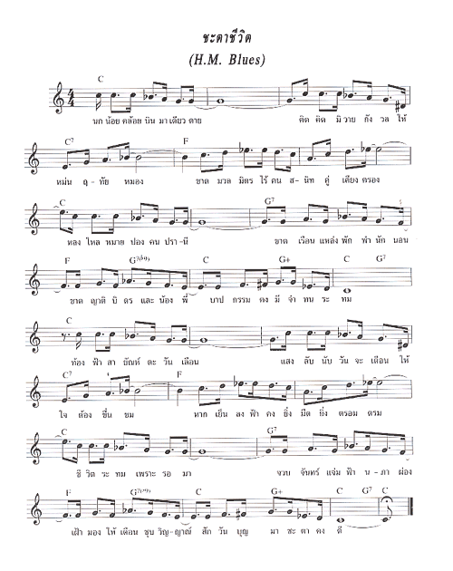 เนื้อเพลงมีใจความว่า "คนอื่น ๆ ที่ไม่ได้เล่นดนตรี ต่างก็อิ่มหนำสำราญกัน แต่พวกเราที่กำลังเล่นดนตรีต่างก็หิวโหย และไม่มีแรงจะเล่นต่อไปอีกแล้ว" ในงานไม่มีผู้ใดทายชื่อถูกเลยสักคนเดียว เพราะทุกคนต่างคิดว่า H.M. Blues ย่อมาจาก His Majesty 's Blues ซึ่งแปลว่าเพลงแนวบลูส์ของพระบาทสมเด็จพระเจ้าอยู่หัว แต่แท้ที่จริงแล้ว H.M.Blues ย่อมาจาก Hungry Men's Blues แปลว่าเพลงแนวบลูส์ของผู้ที่หิวโหยต่างหาก