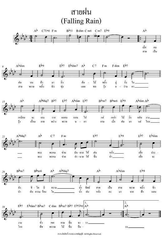 เป็นเพลงพระราชนิพนธ์ลำดับที่ 3 ทรงพระราชนิพนธ์ใน พ.ศ.2489 ขณะทรงเป็นสมเด็จพระอนุชาธิราช เป็นงานทดลองของพระองค์ในจังหวะวอลซ์ ทรงพระกรุณาโปรดเกล้าฯ ให้พระเจ้าวรวงศ์เธอ พระองค์เจ้าจักรพันธ์เพ็ญศิริ นิพนธ์คำร้องภาษาไทย ส่วนภาษาอังกฤษ พระเจ้าวรวงศ์เธอ พระองค์เจ้าจักรพันธ์เพ็ญศิริ ทรงแต่งร่วมกับท่านผู้หญิงนพคุณ ทองใหญ่ ณ อยุธยา เพลงพระราชนิพนธ์สายฝนนี้บรรเลงครั้งแรกที่เวทีลีลาศสวนอัมพร เมื่อวันอาทิตย์ที่ 2 มิถุนายน พ.ศ.2489 ในงานรื่นเริงของ สมาคมส่งเสริมการเลี้ยงไก่แห่งประเทศไทย บรรเลงโดยวงสุนทราภรณ์ ขับร้องโดย เพ็ญศรี พุ่มชูศรี ในเวลาต่อมาเพลงนี้นำมาขับร้องใหม่โดย รุ่งฤดี แพ่งผ่องใส , นภา หวังในธรรม, สวลี ผกาพันธ์