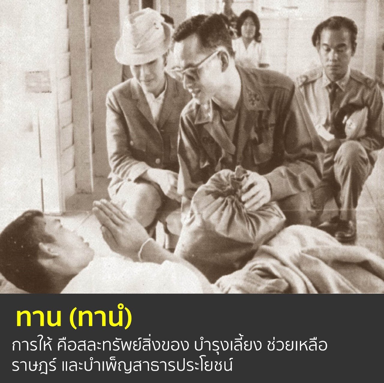 การให้ การเสียสละ หมายถึง การเสียสละพระราชทรัพย์ เพื่อบำเพ็ญสาธารณประโยชน์ทั้งในด้านบำรุงพระพุทธศาสนาและบรรเทาความยากไร้ ให้ประชาชนอยู่เป็นกิจวัตร ทั้งยังทรงเป็นผู้นำในการบริจาคพระราชทรัพย์เพื่อช่วยเหลือผู้ตกทุกข์ได้ยาก จากภัยธรรมชาติหลายต่อหลายครั้ง นอกจากทรัพย์แล้ว ทาน ของในหลวงยังหมายถึงพระราชทานความรู้ เพื่อประชาชนจะได้ใช้เป็นเครื่องมือเลี้ยงชีพได้อย่างยั่งยืน