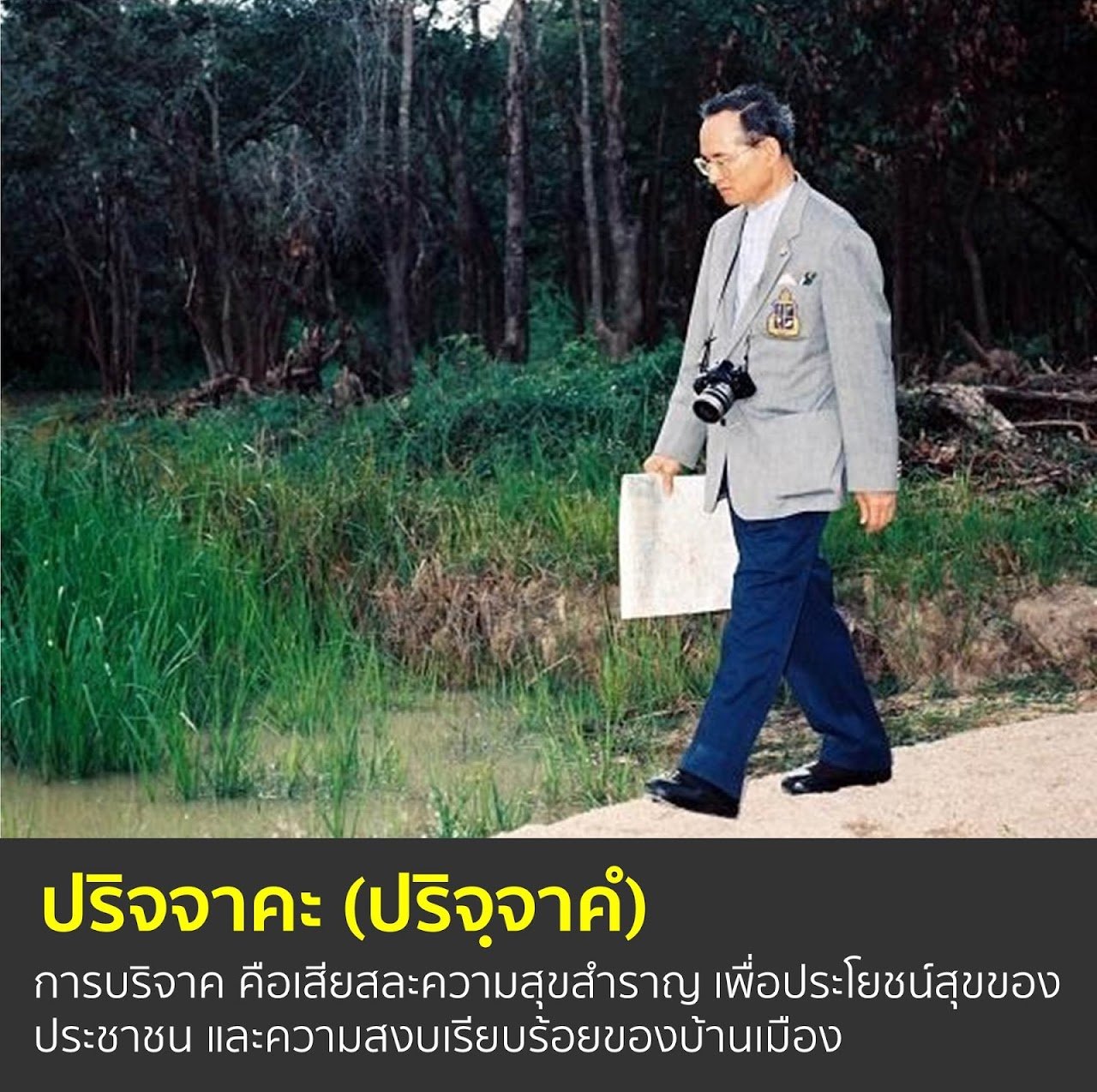 การเสียสละความสุขส่วนตน เพื่อความสุขส่วนรวม เสียสละความสุขส่วนพระองค์ เพื่อประชาชนมีความสุข ในพระราชกรณียกิจที่เป็นไปเพื่อแก้ปัญหาความเดือดร้อนของประชาชนนั้น ในหลวงต้องเสียสละความสุขส่วนพระองค์ ต้องทนลำบากในการเดินทาง อดทนต่อความแปรปรวนของอากาศ ความร้อนหนาว ก็เพื่อสร้างความสุขให้ประชาชนทั้งสิ้น