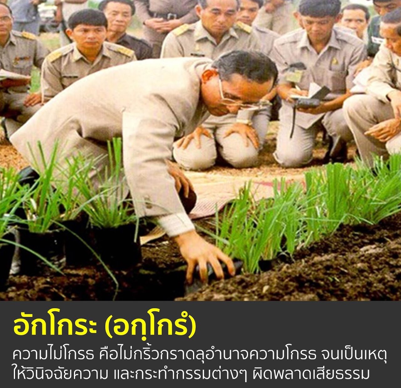 อักโกธะ หมายถึง ความไม่โกรธ ไม่อาฆาตพยาบาท พระบาทสมเด็จพระปรมินทรมหาภูมิพลอดุลยเดชทรงบำเพ็ญให้เป็นที่ประจักษ์แก่ประชาชนชาวไทยและนานาประเทศมาเป็นเวลาช้านาน