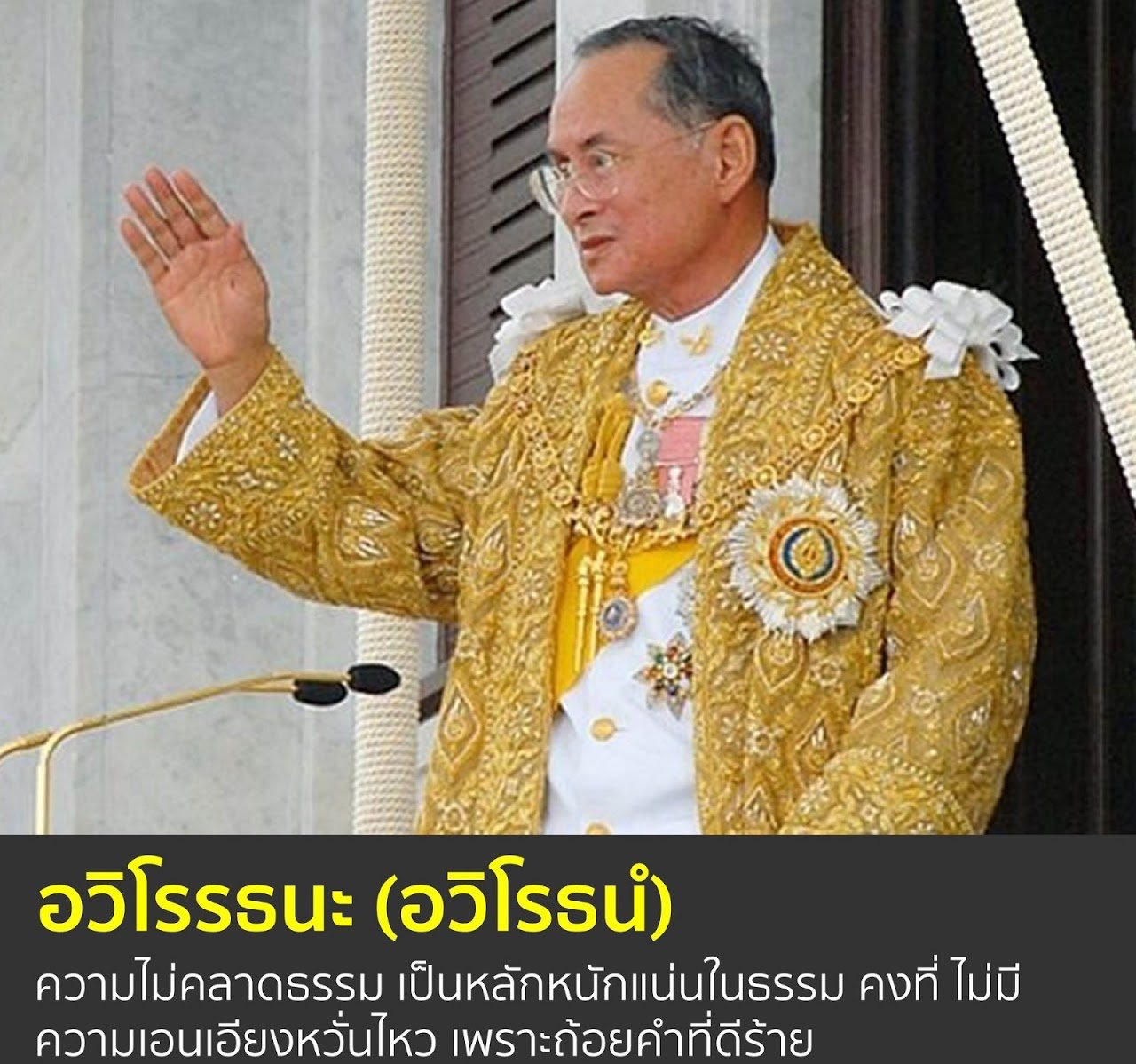พระบาทสมเด็จพระปรมินทรมหาภูมิพลอดุลยเดชมีพระบรมราโชวาทเตือนสติแก่รัฐบาล ข้าราชการ และประชาชนโดยทั่วไปให้ตั้งต้นอยู่ในความซื่อสัตย์สุจริตยุติธรรมและเที่ยงธรรมอยู่เสมอ อย่าให้มีอคติความลำเอียงหรือความหวั่นไหวด้วยเหตุใดเหตุหนึ่งมาครอบงำได้ ดังที่ปรากฏในหนังสือธ ร่มเกล้า ชาวสยาม ความว่า