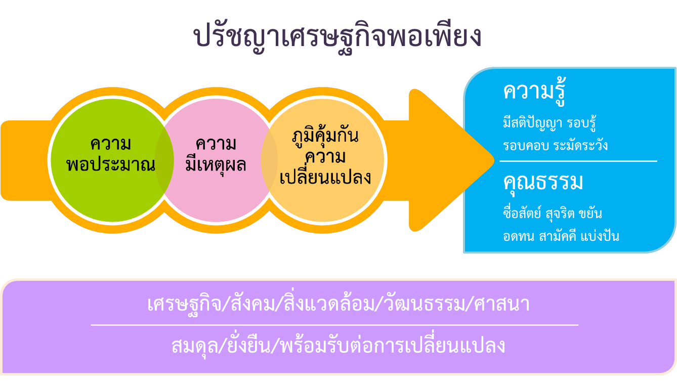 ▪ เศรษฐกิจพอเพียงเป็นหลักความคิดที่จะดำเนินการเรื่องต่าง ๆ เพื่อนำชีวิตไปสู่ความสมดุล มั่นคง และยั่งยืน เสมือนเป็นการวางฐานรากของตัวอาคาร ดังปรัชญาของเศรษฐกิจพอเพียงที่ได้พระราชทานไว้ ดังนี้